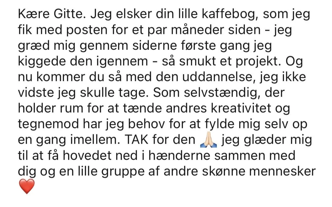 Jeg vil på det varmeste anbefale alle, der trænger til kreativ boost i hverdagen, at deltage i et kursus eller en workshop hos Gitte.